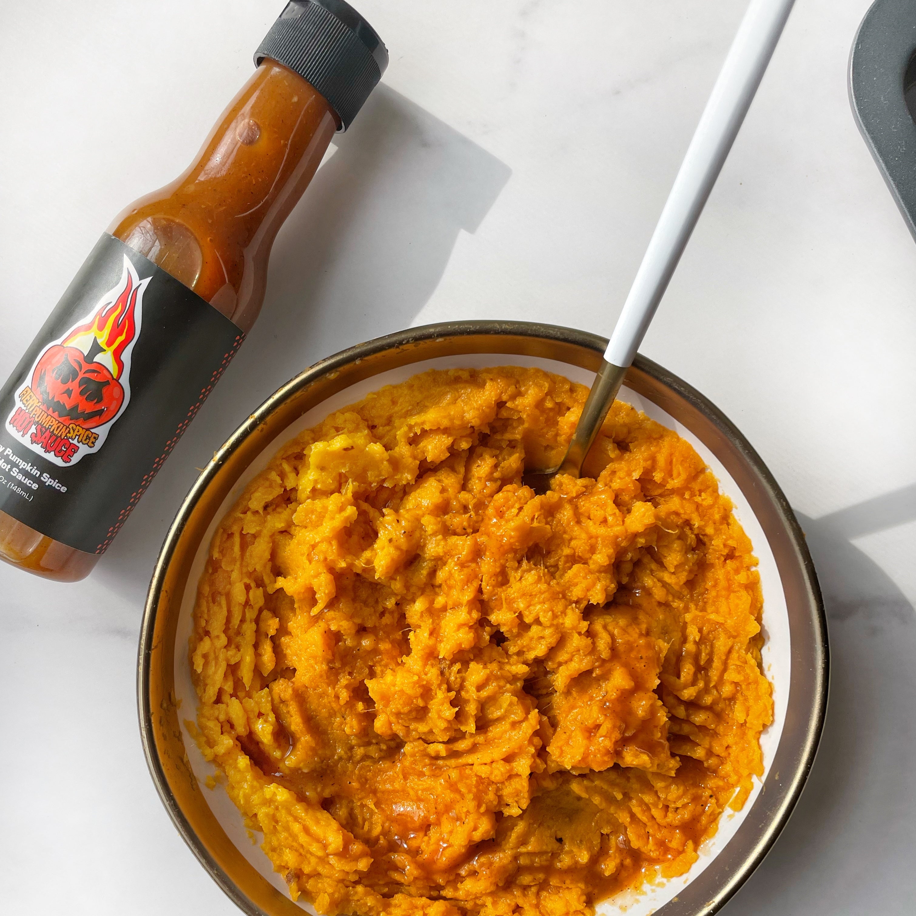 Spice up your meal with Zesti's Spicy Mashed Sweet Potatoes. These tender sweet potatoes are mashed with a hint of Pumpkin Spice Hot Sauce and a dash of butter, creating a flavor sensation that's perfect for adding some heat to your dinner table!