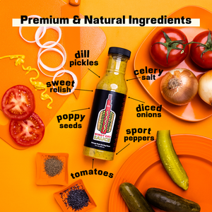 Not a packet of ketchup in sight. Blended to perfection, our Windy City Sauce combines all da toppings of a Chicago hot dog — yellow mustard, dill pickles, tomatoes, sport peppers, diced onions, celery salt, and sweet relish — to bring yous a unique flavor combination that both da Northsiders and da Southsiders can agree on.